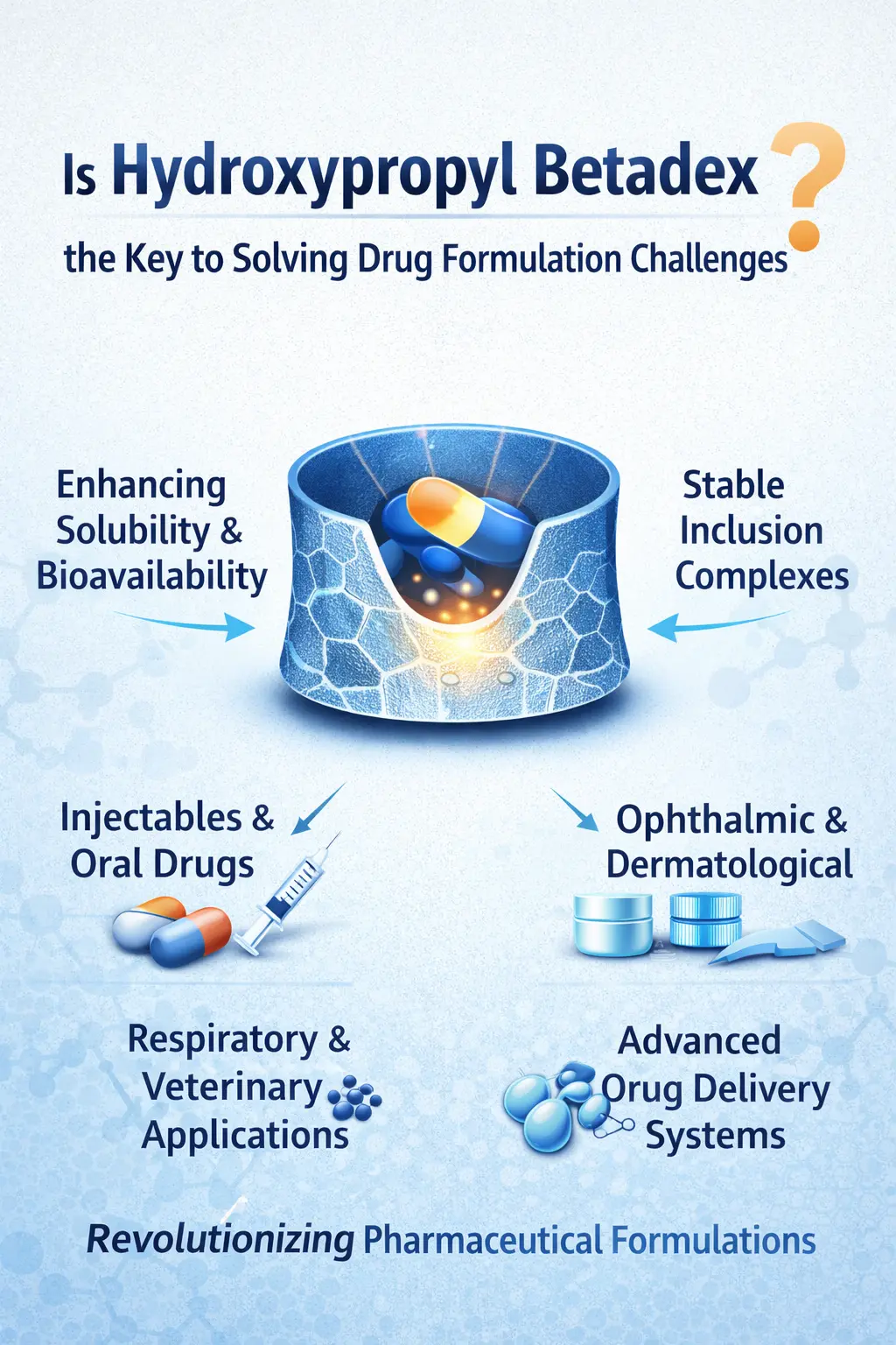 Το Hydroxypropyl Betadex είναι ένα μεγάλο βήμα προόδου στην τεχνολογία των παραγώγων κυκλοδεξτρίνης. Αυτό το υδρόφιλο πολυμερές λειτουργεί εγκλωβίζοντας μόρια και σχηματίζοντας σταθερά συμπλέγματα εγκλεισμού με μόρια φαρμάκων που δεν τους αρέσει το νερό. Σε σύγκριση με τη φυσική β-κυκλοδεξτρίνη, το υποκατάστατο υδροξυπροπυλίου το καθιστά πιο διαλυτό στο νερό, γεγονός που το καθιστά πολύ χρήσιμο για ιατρικές χρήσεις.